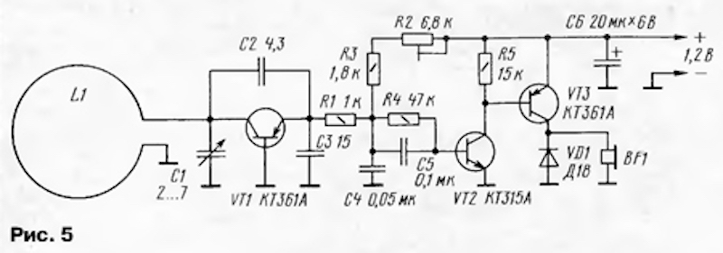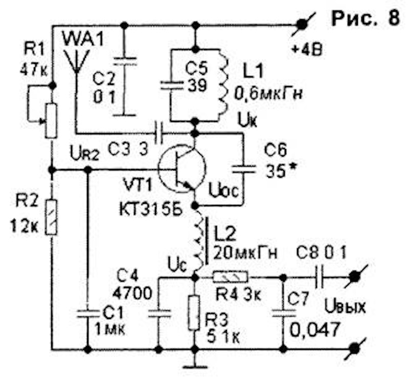 собой обычный вч-генератор. При включении питания через R2 R3