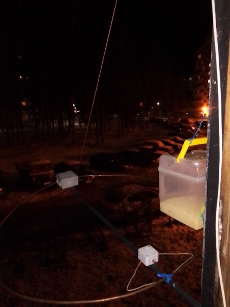 сиби, края антенны прикрепив к стене через короткие изоляторы, а