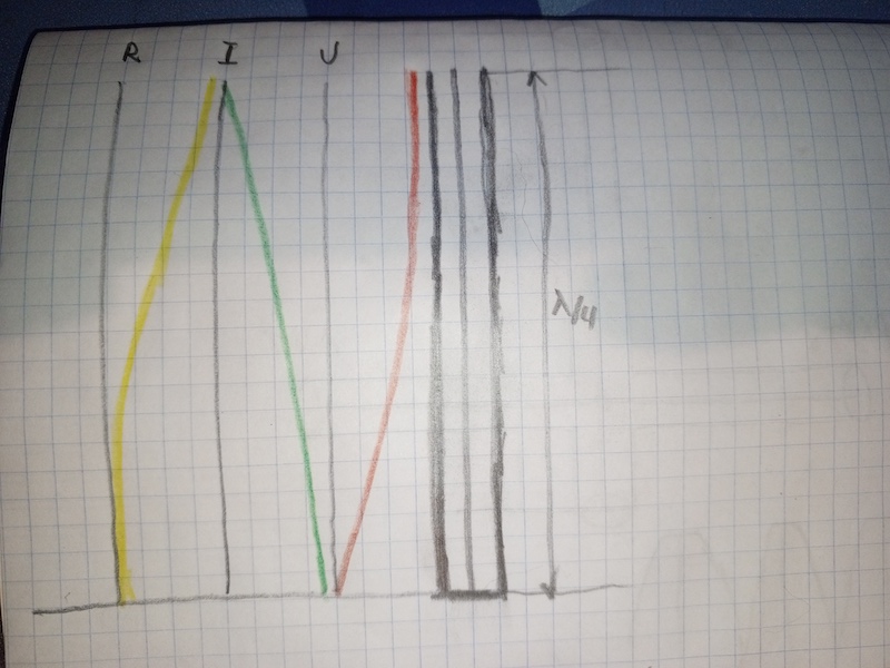 Взглянем на распределение тока и напряжения по такому резонатору, и