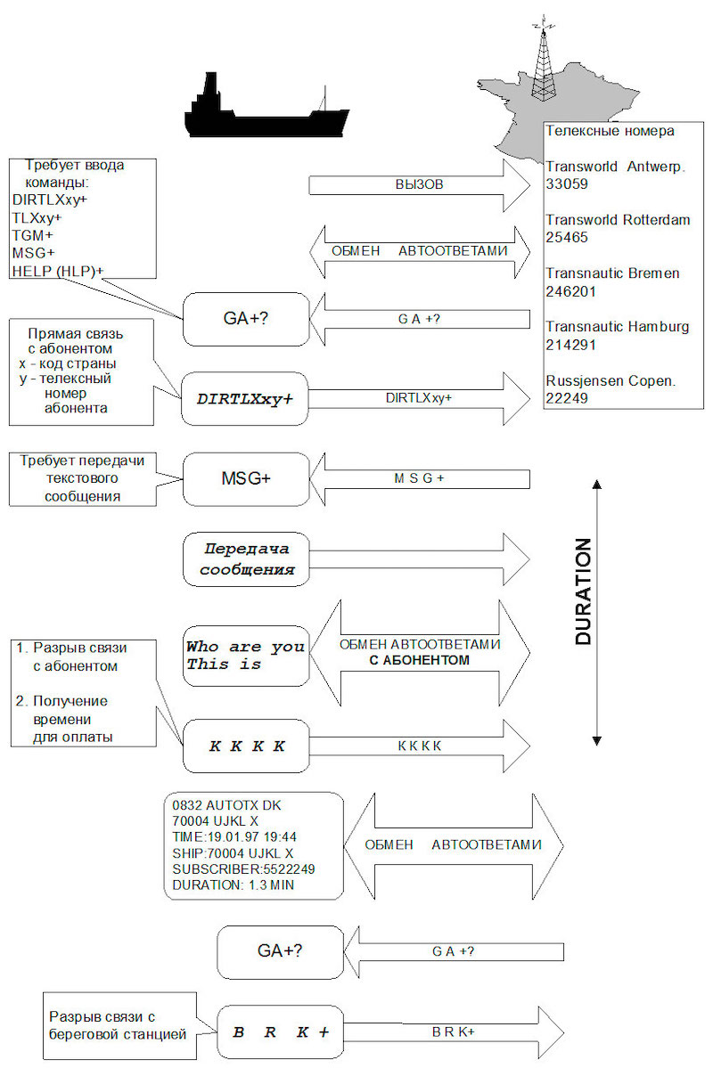 TELEX с помощью судовых КВ радиостанций через береговые станции.