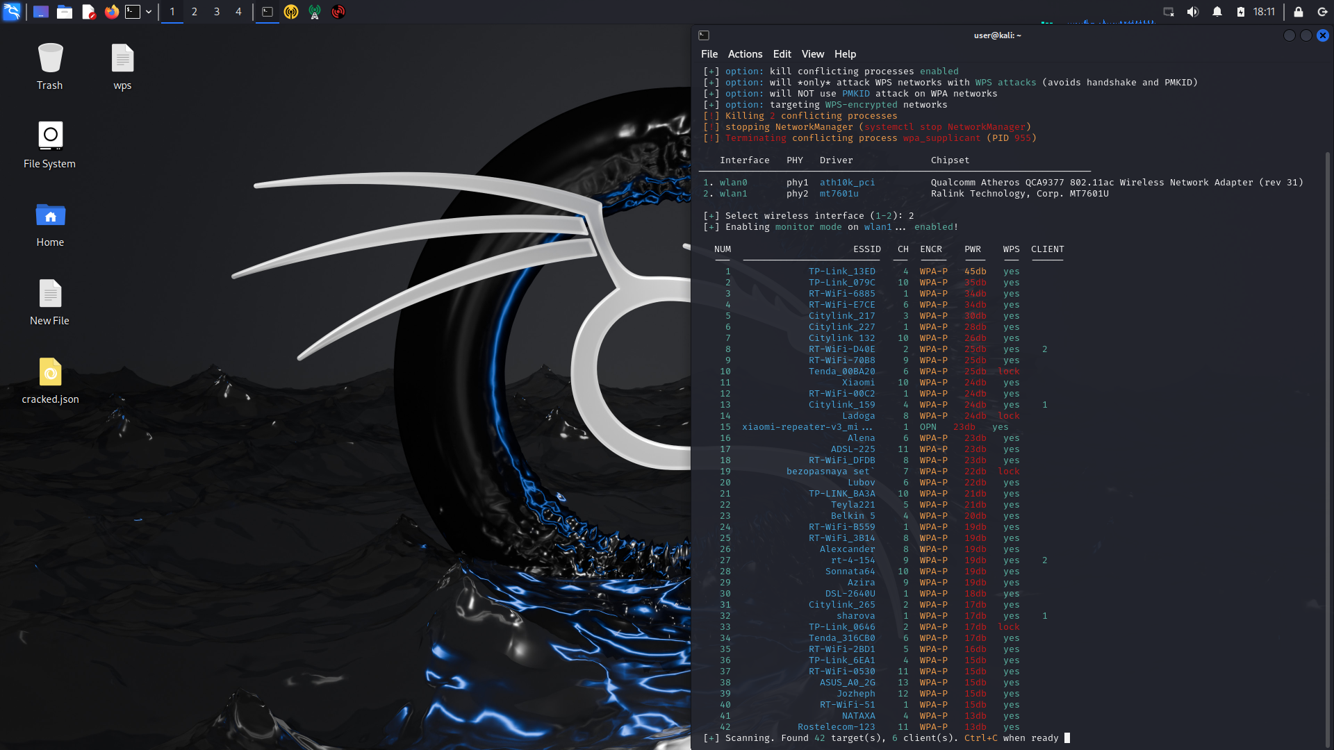 режиму мониторинга процессы, --wps-only и --no-pmkid для ускорения
